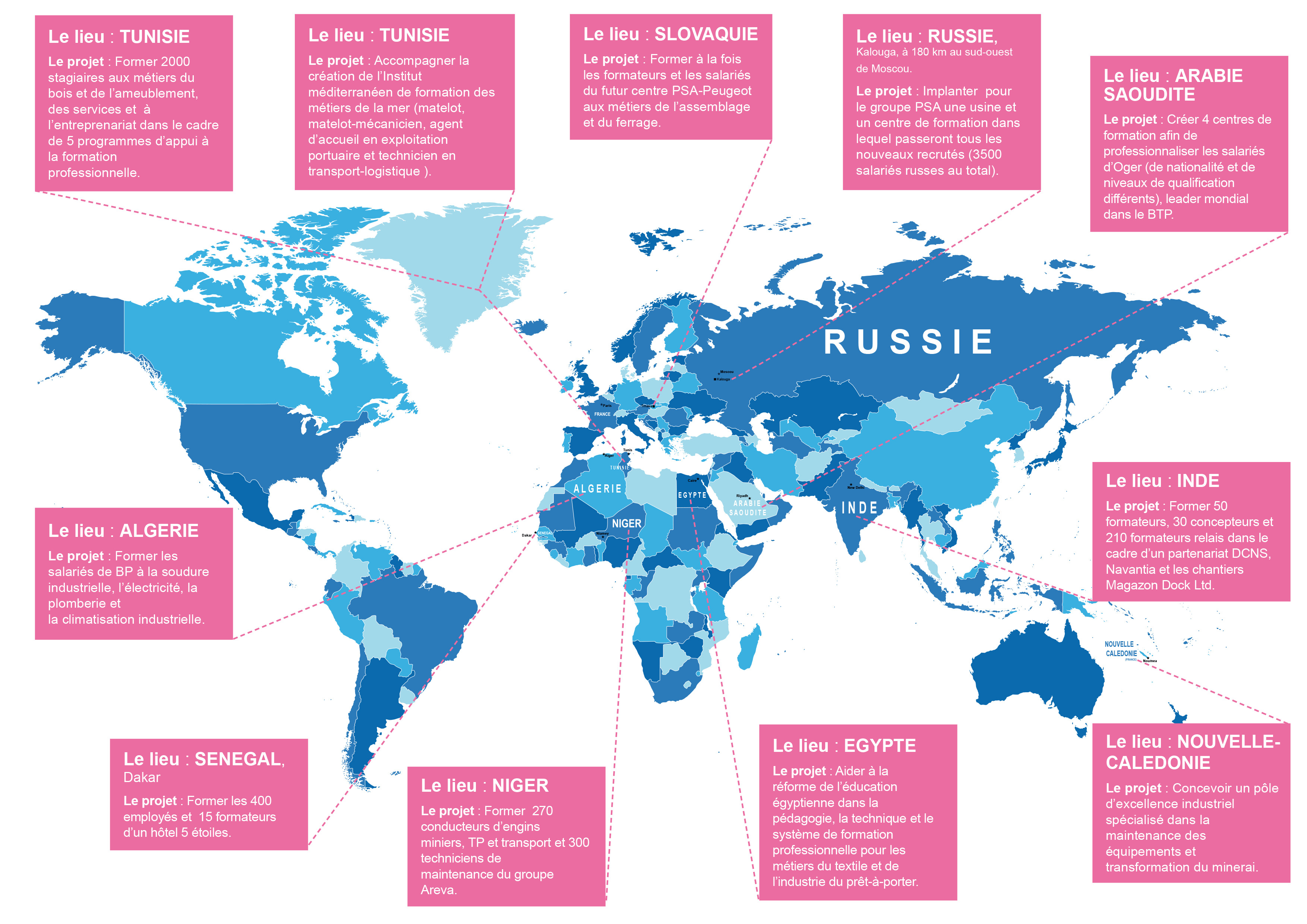 Sénégal, Cameroun, Egypte, Maroc, Tunisie, Gabon, Arabie Saoudite, Russie, Macédoine, Pologne, Estonie, Vietnam … nous intervenons depuis de nombreuses années, dans le cadre d’accords de coopération bilatérales ou par appui à la conquête de marchés, en Afrique, Moyen-Orient, Asie et Europe .